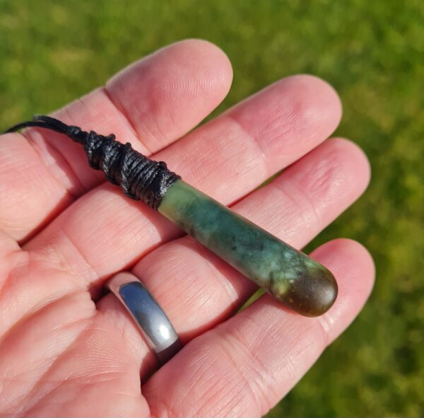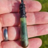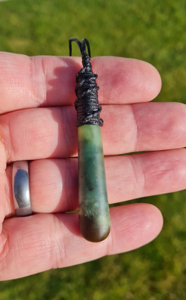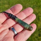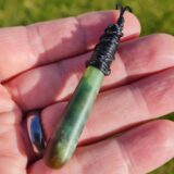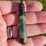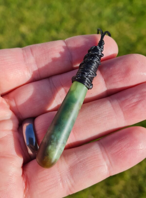 Lashed pounamu teardrop pendant 6.1cm long by 1.1cm wide.