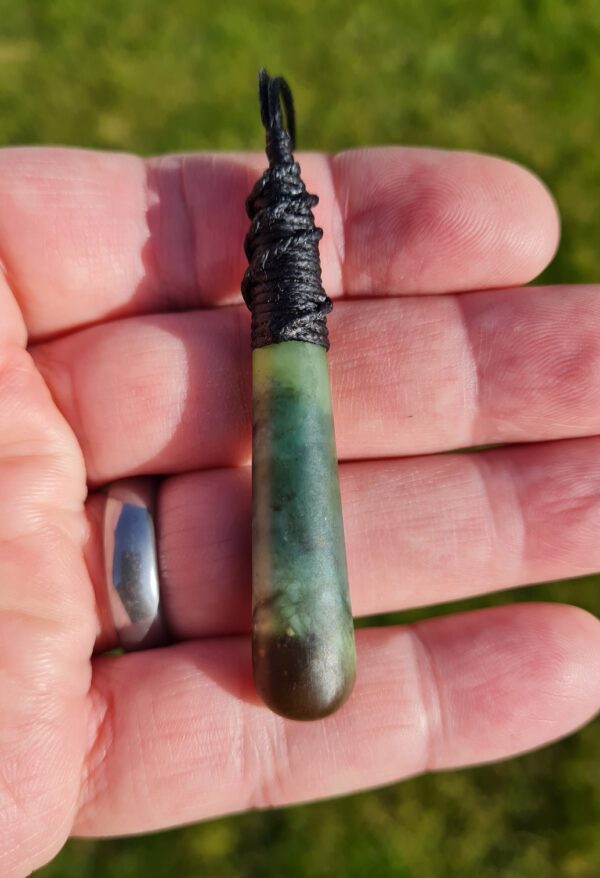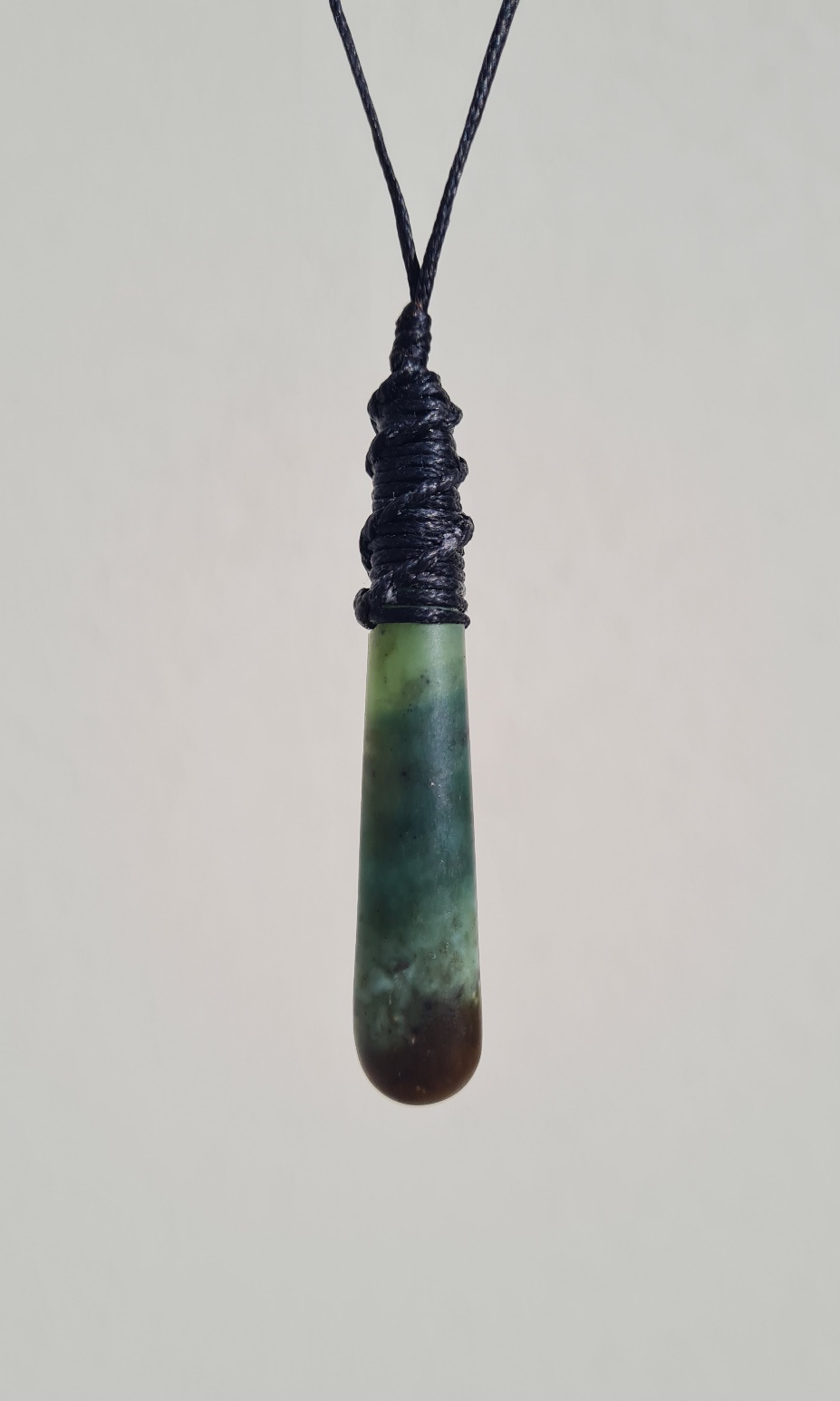 Lashed pounamu teardrop pendant.