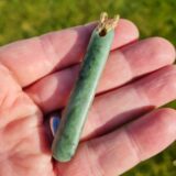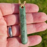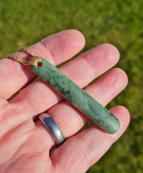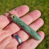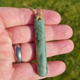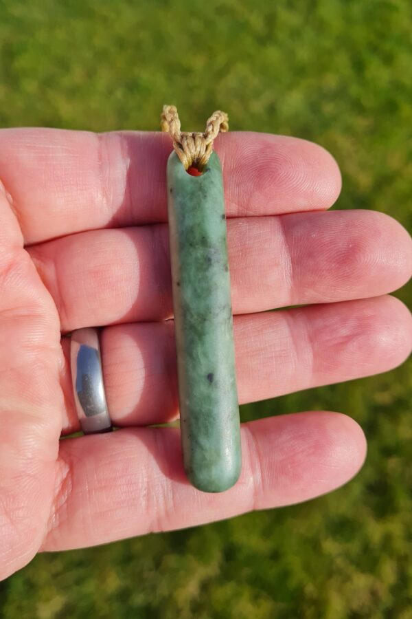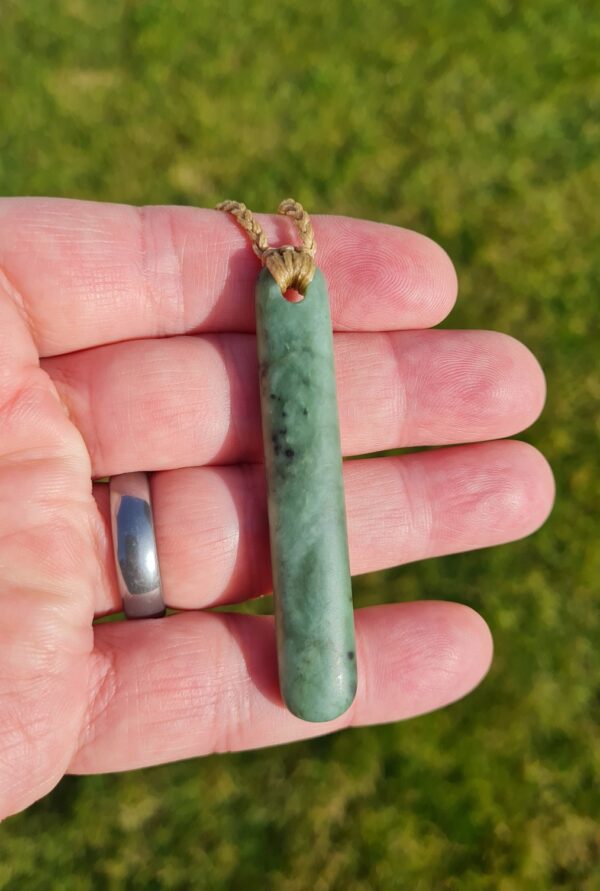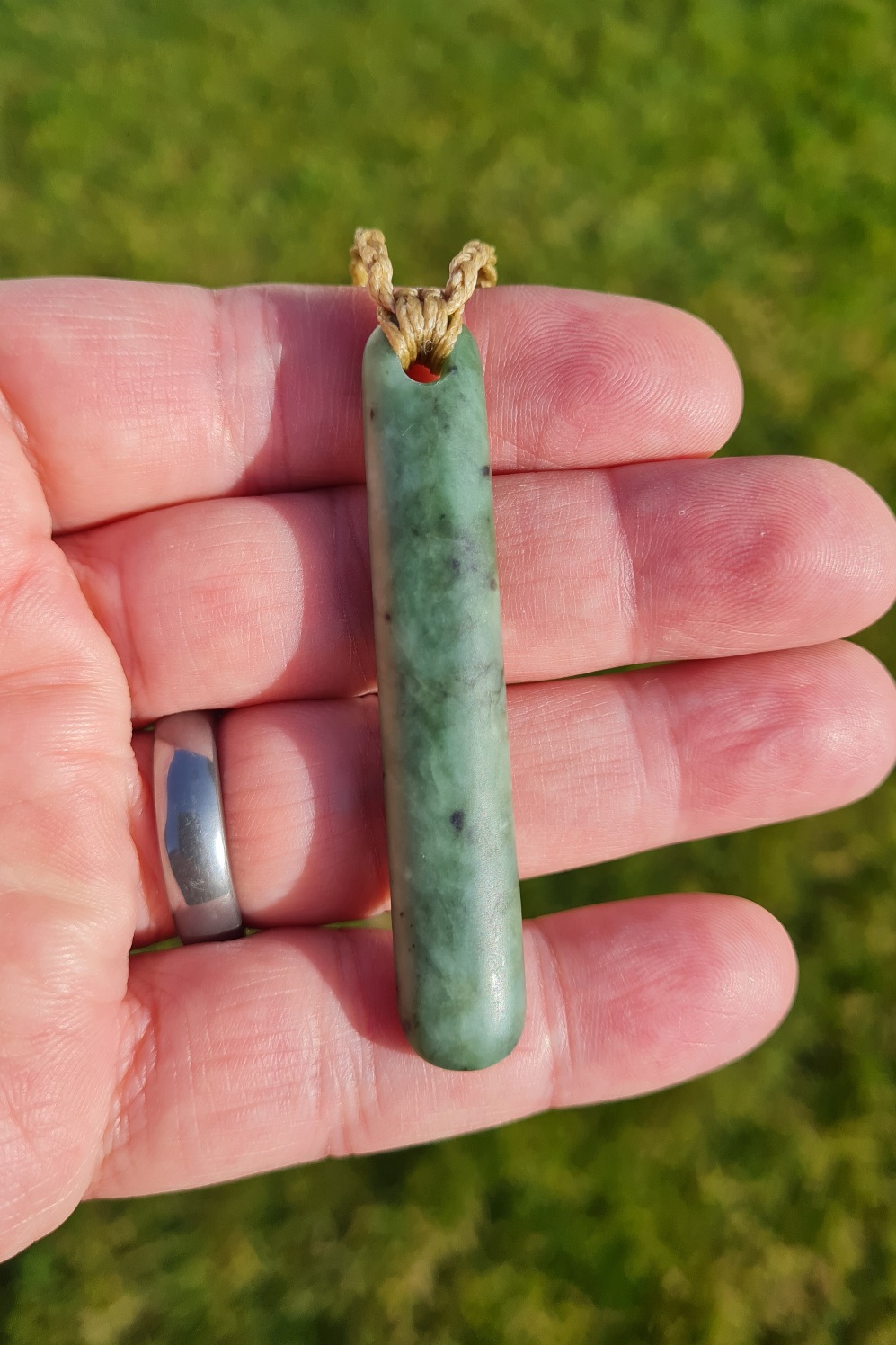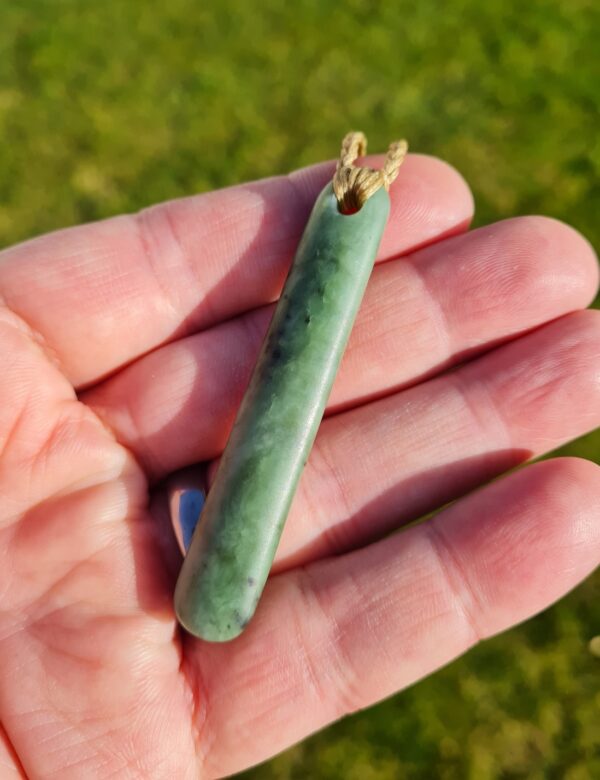 Lashed pounamu teardrop pendant 6.7cm long by 1.1cm wide.
