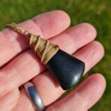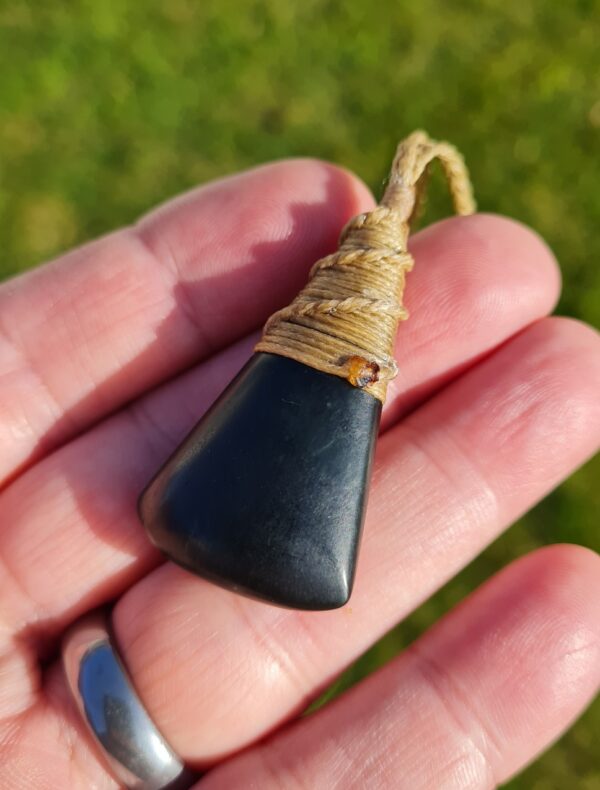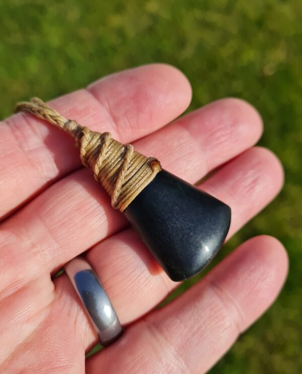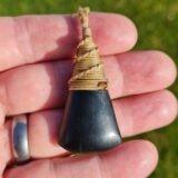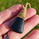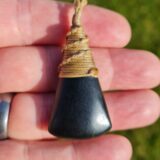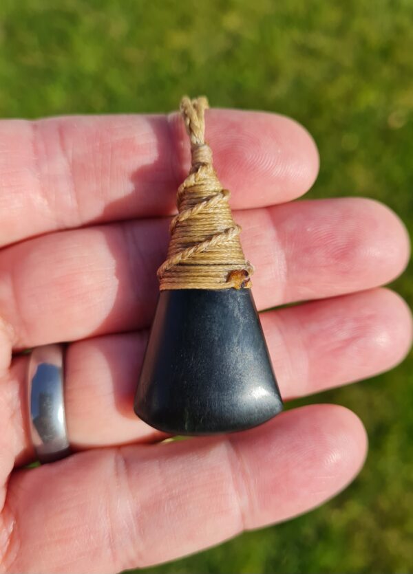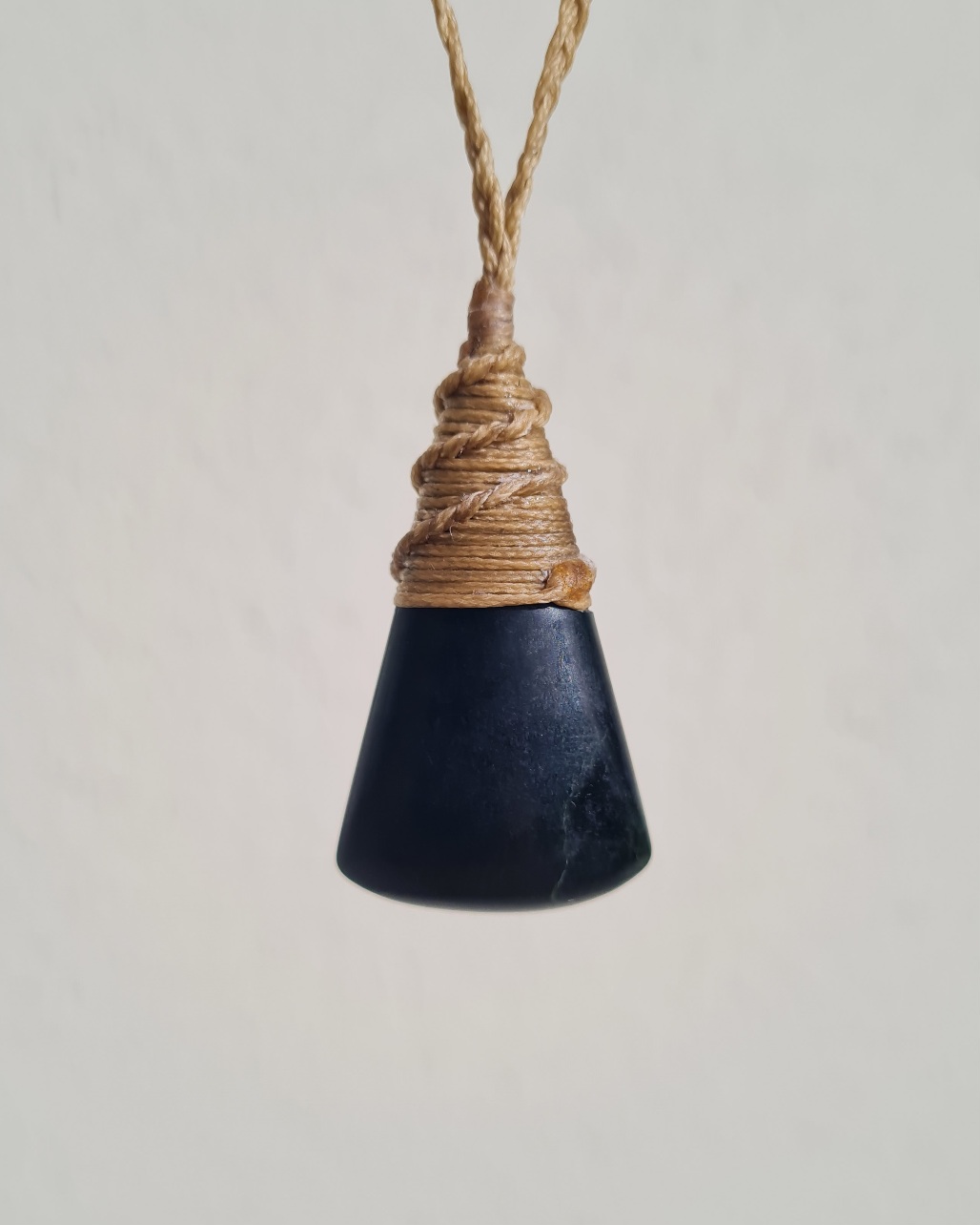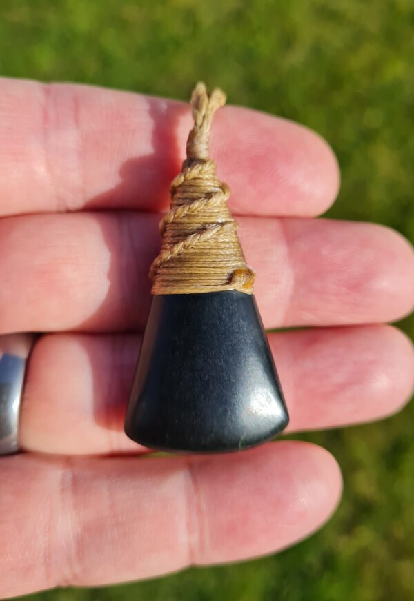 Lashed pounamu teardrop pendant 4.3cm long by 2.4cm wide.
