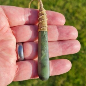 Lashed pounamu teardrop pendant 6cm long by 2.1cm wide.