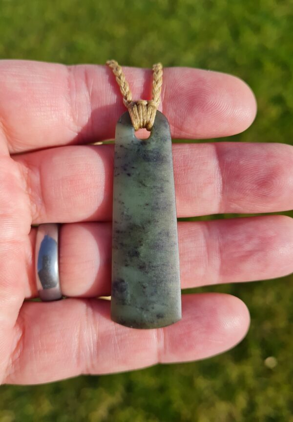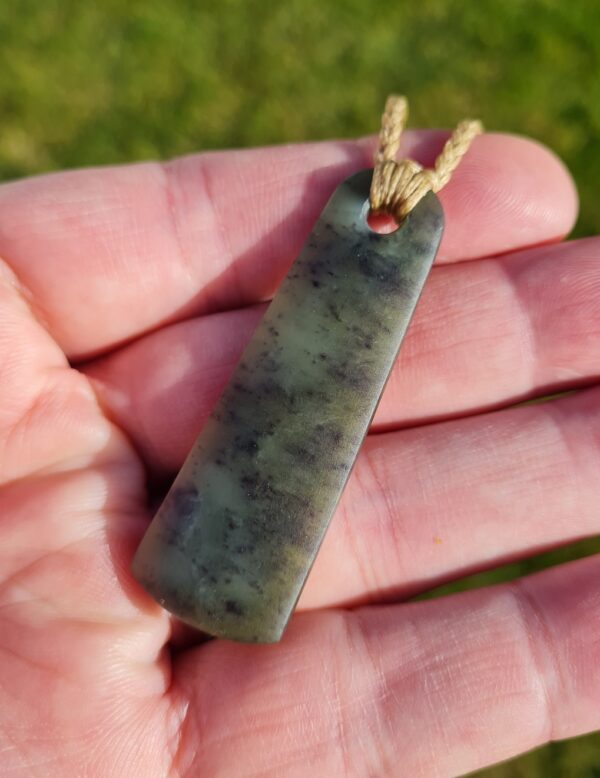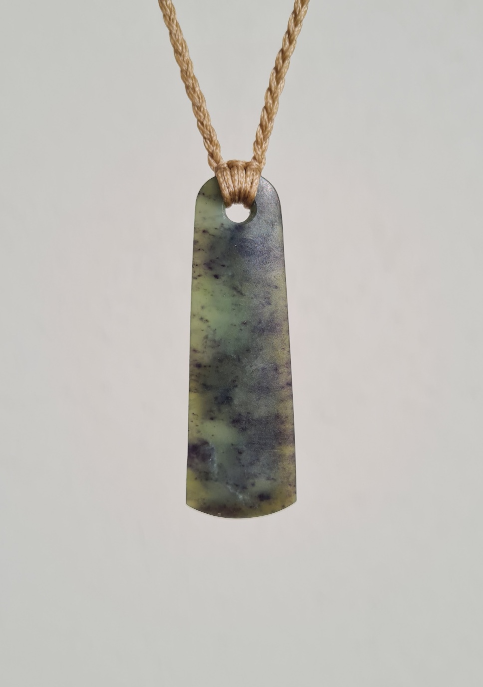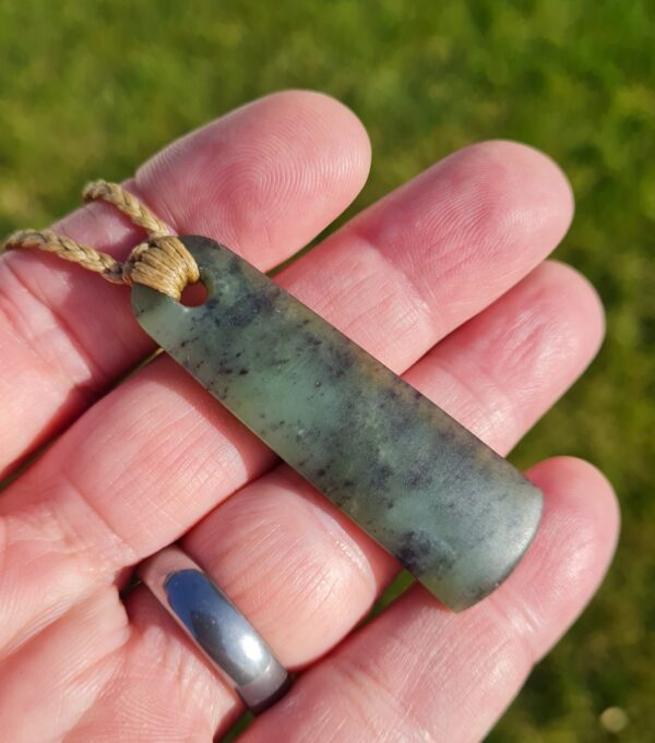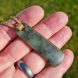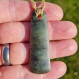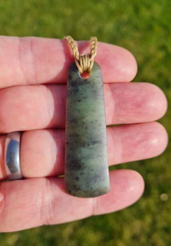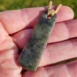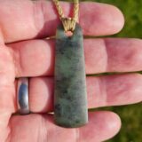 Lashed pounamu teardrop pendant 5.6cm long by 1.8cm wide.