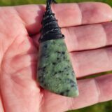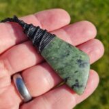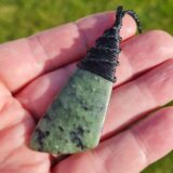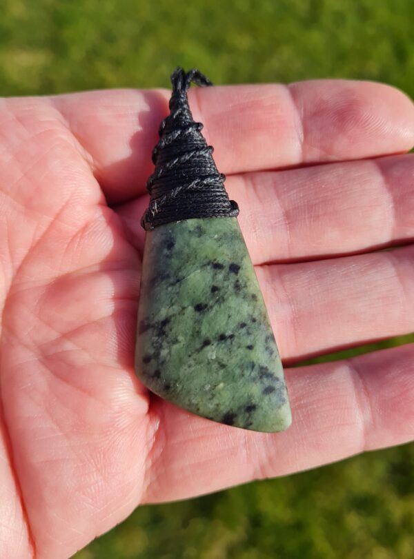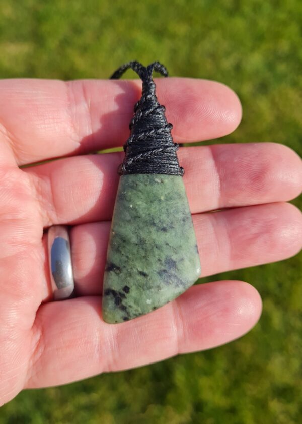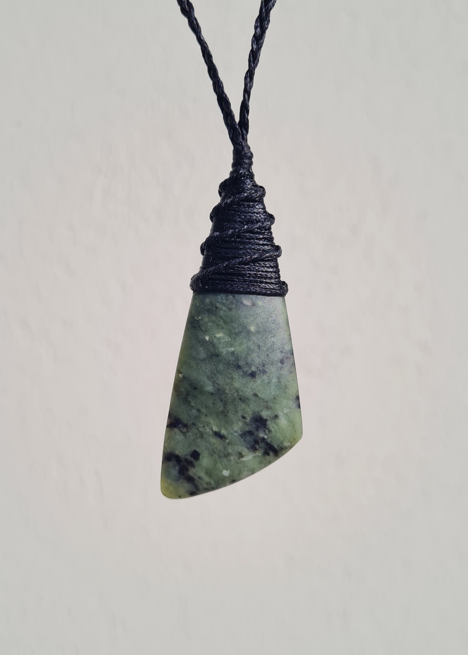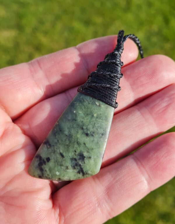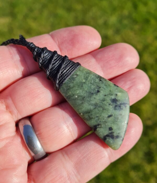 Lashed pounamu teardrop pendant 6.3cm long by 2.5cm wide.