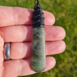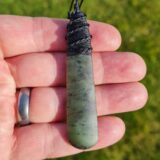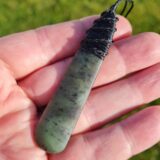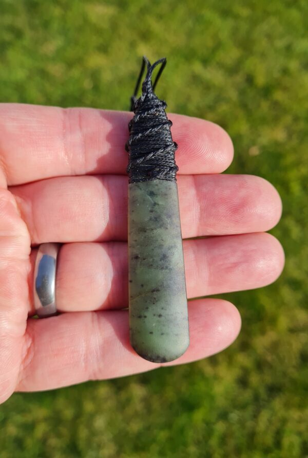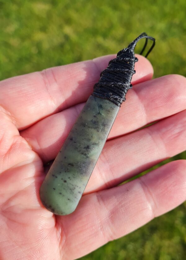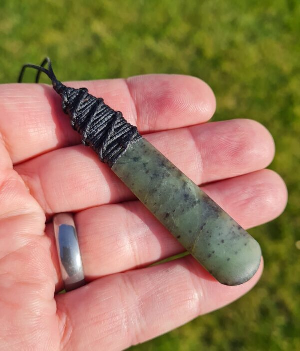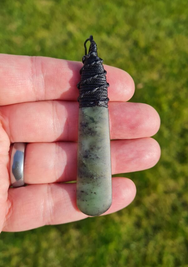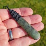 Lashed pounamu teardrop pendant 7.5cm long by 1.5cm wide.