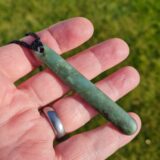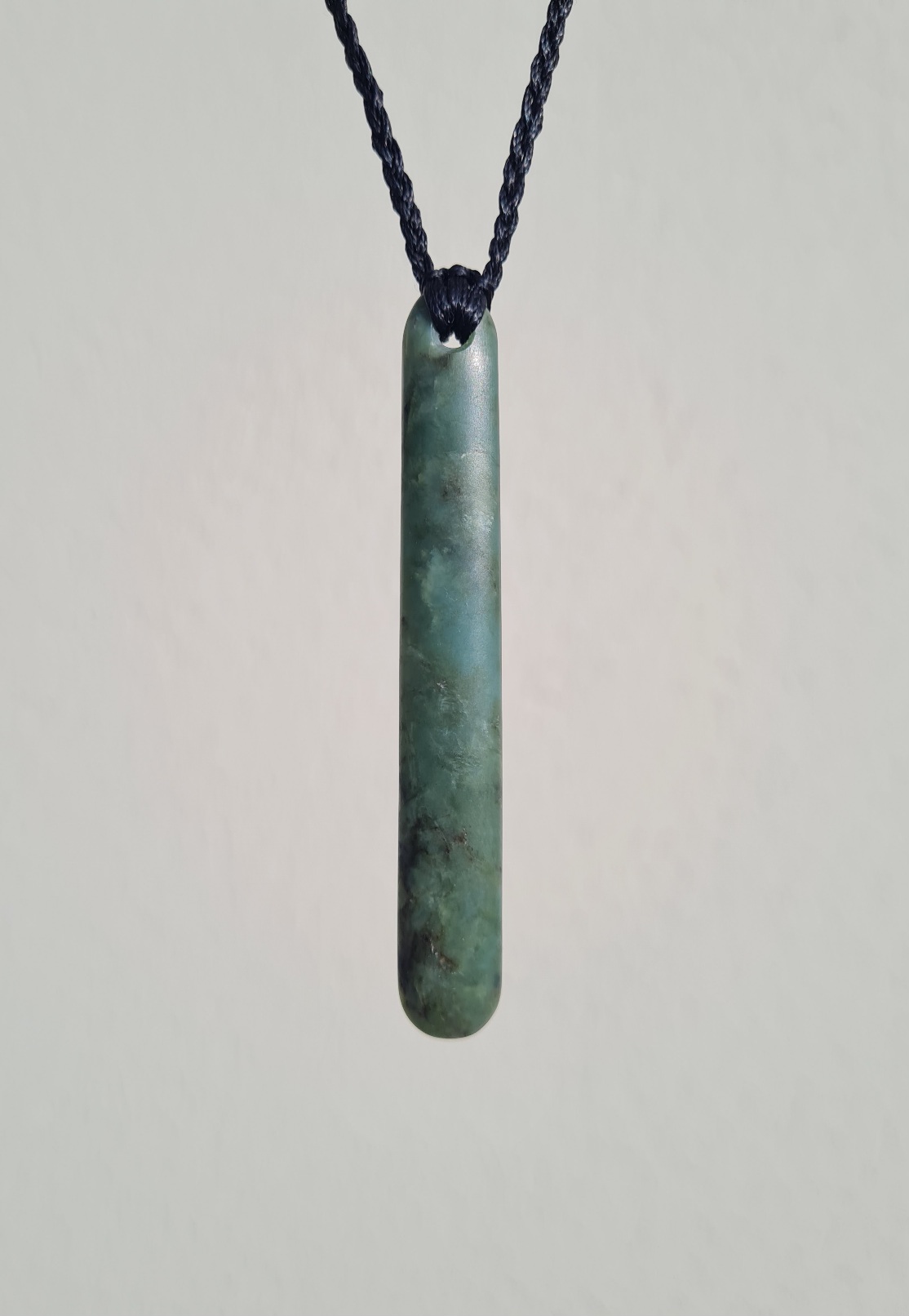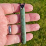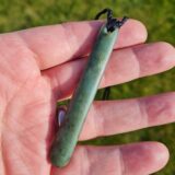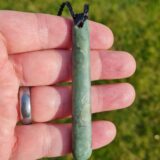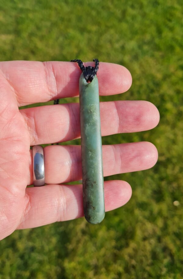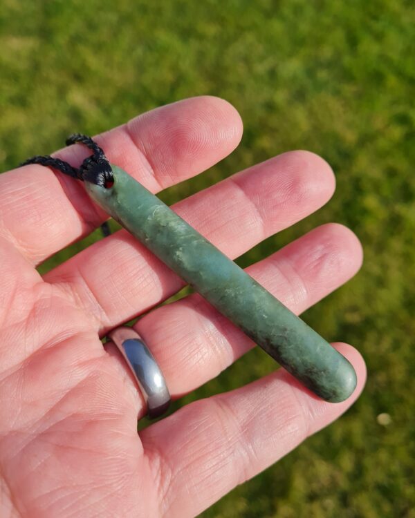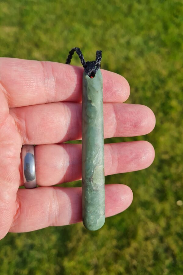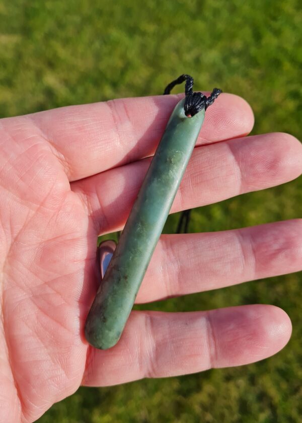 Lashed pounamu teardrop pendant 8.4cm long by 1.2cm wide.