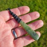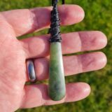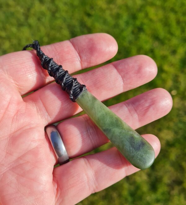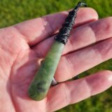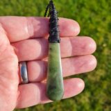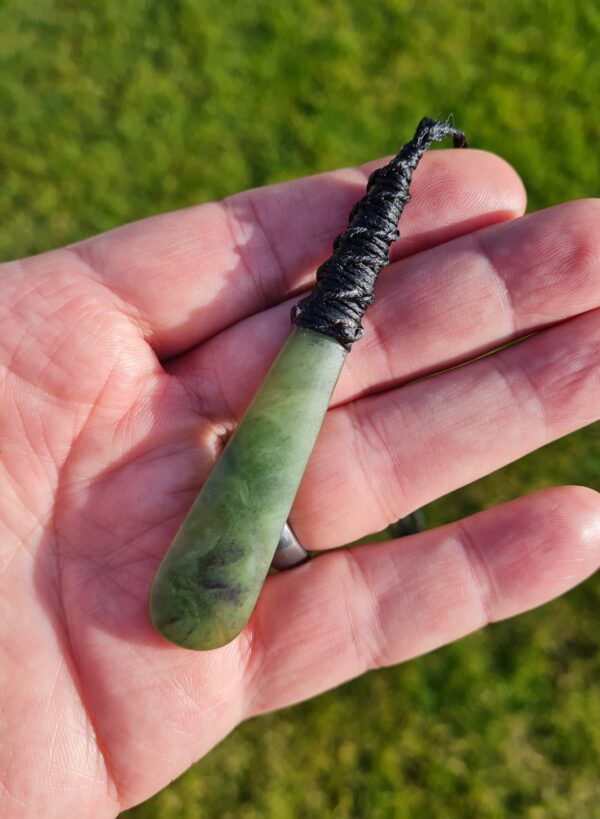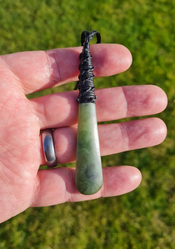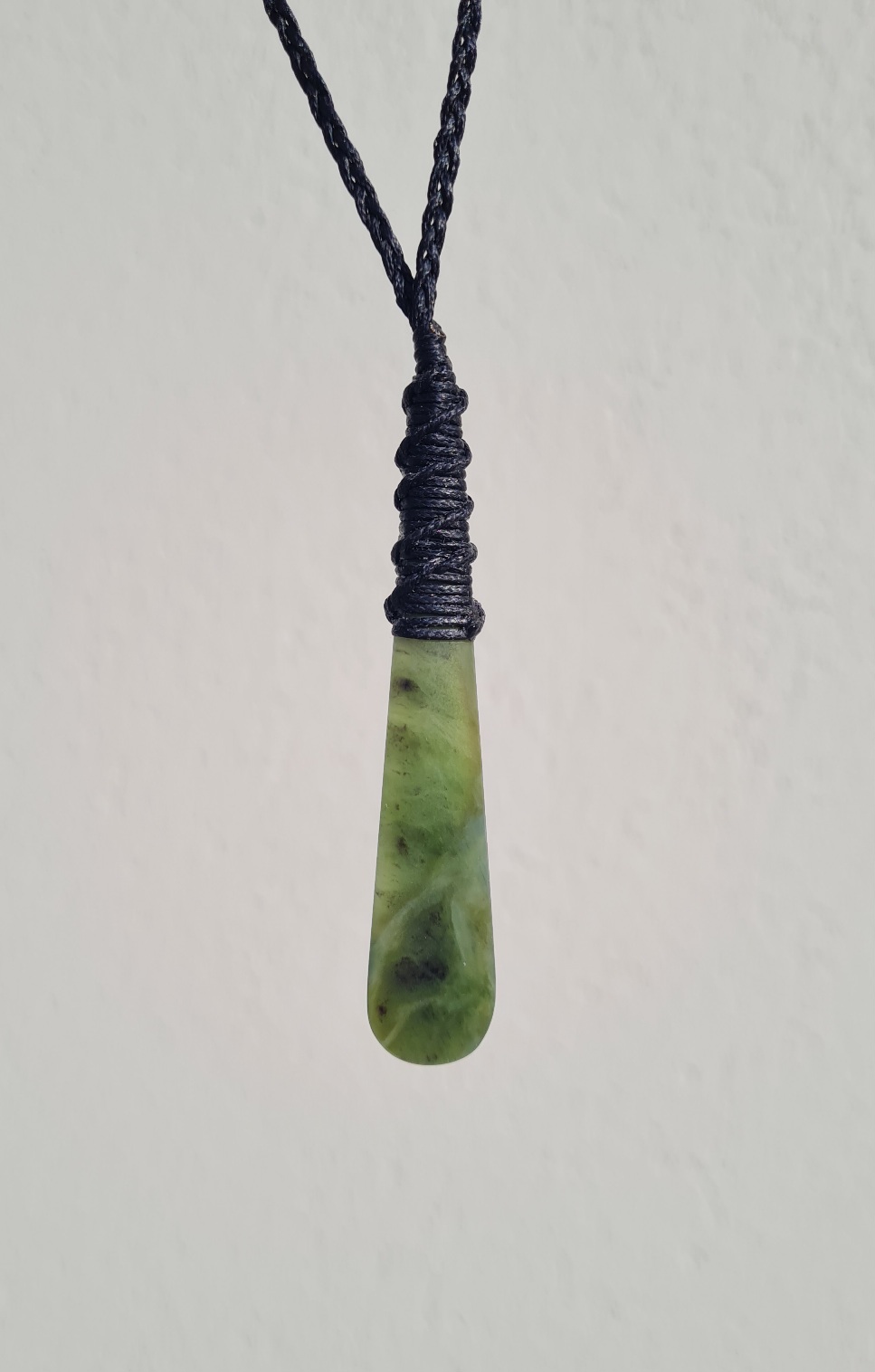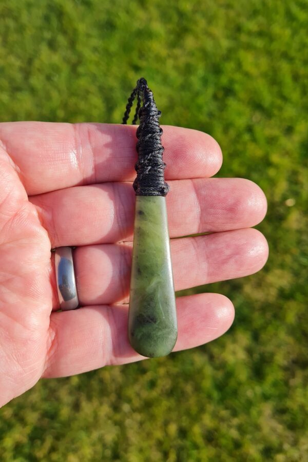 Lashed pounamu teardrop pendant 8.1cm long by 1.6cm wide.