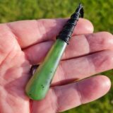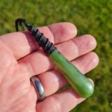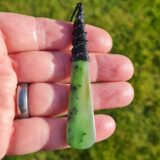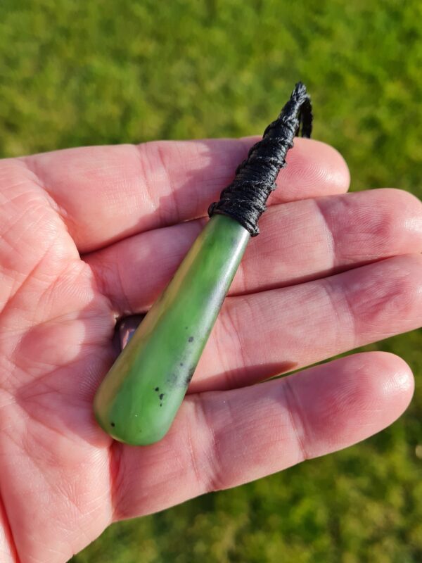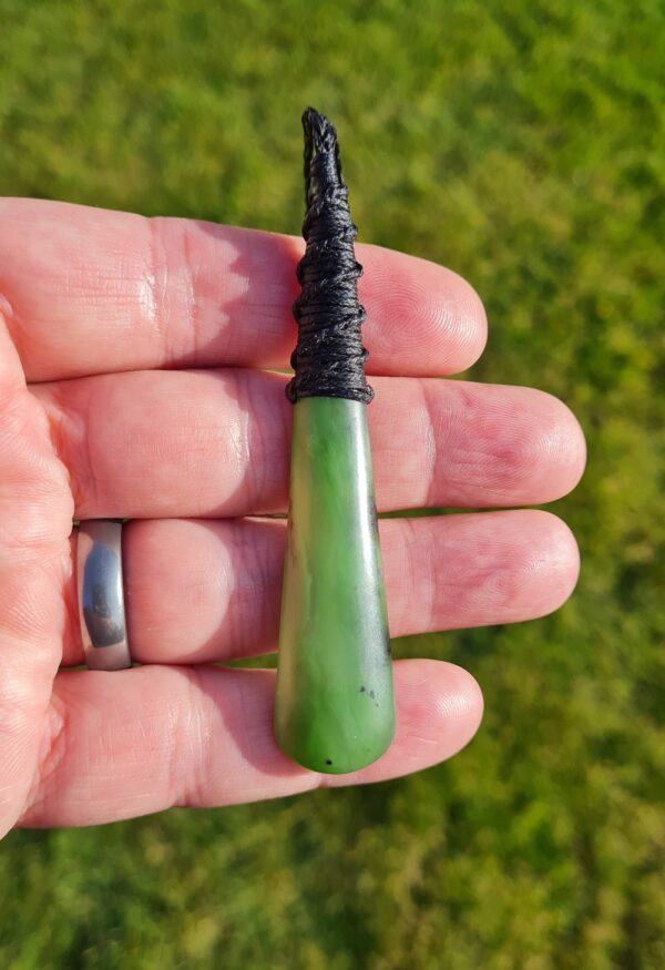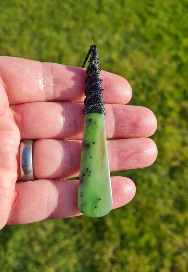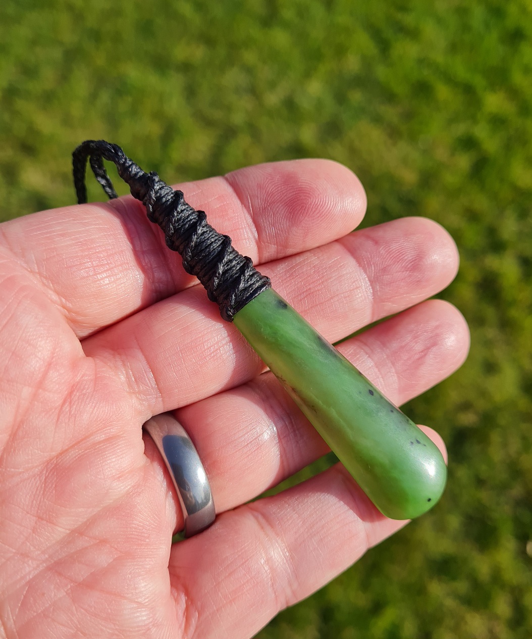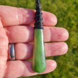 Lashed pounamu teardrop pendant 8.4cm long by 1.7cm wide.