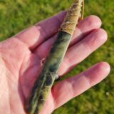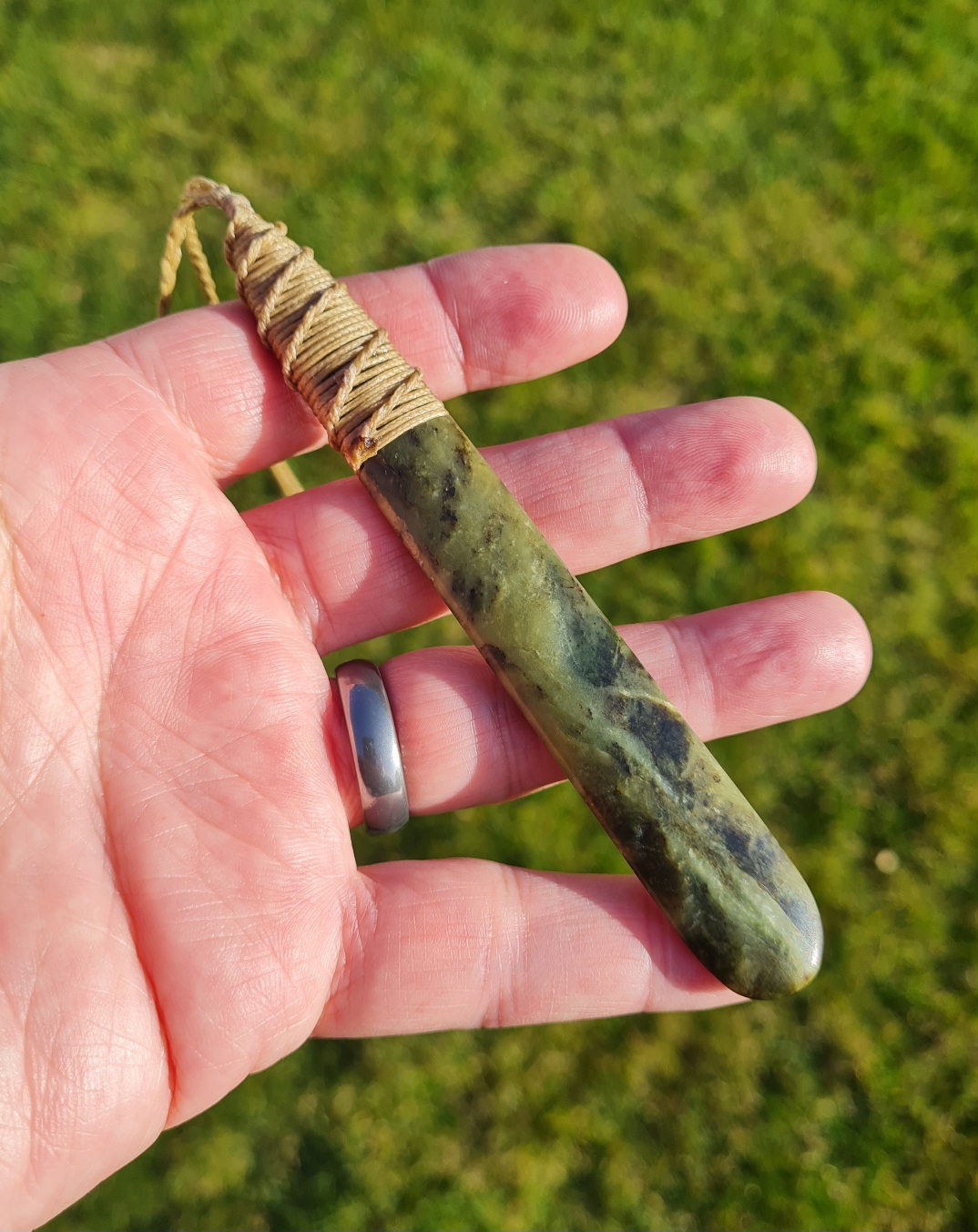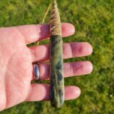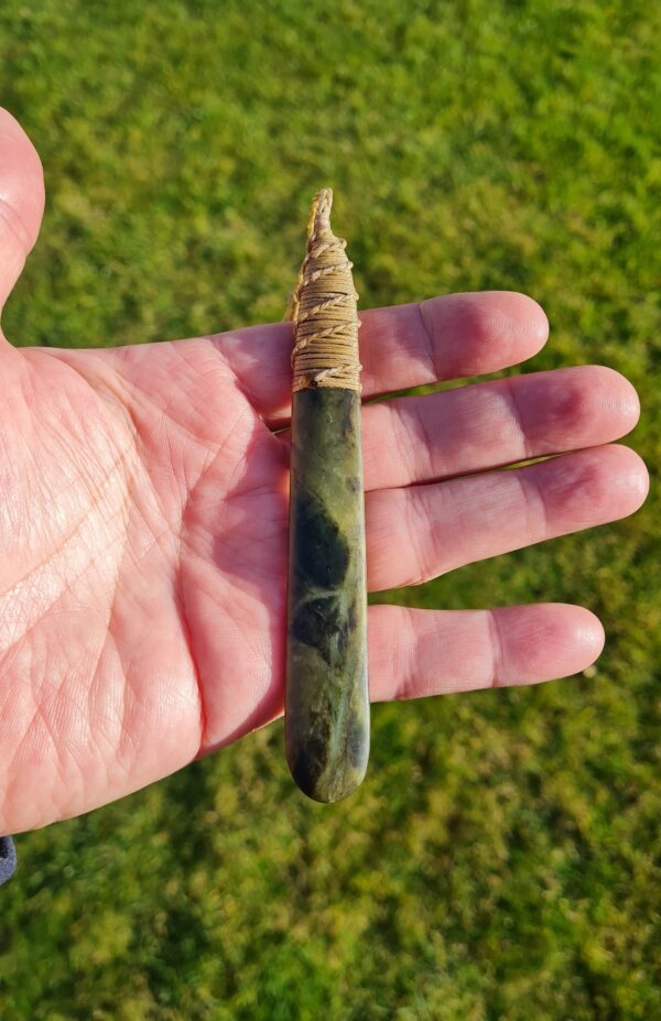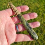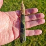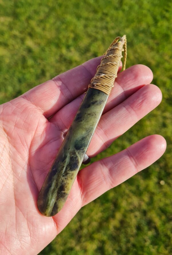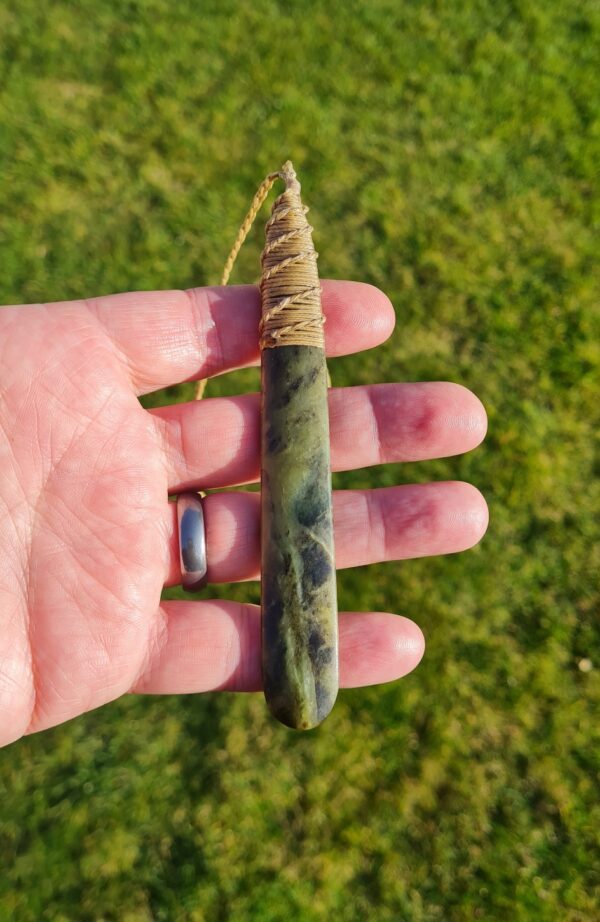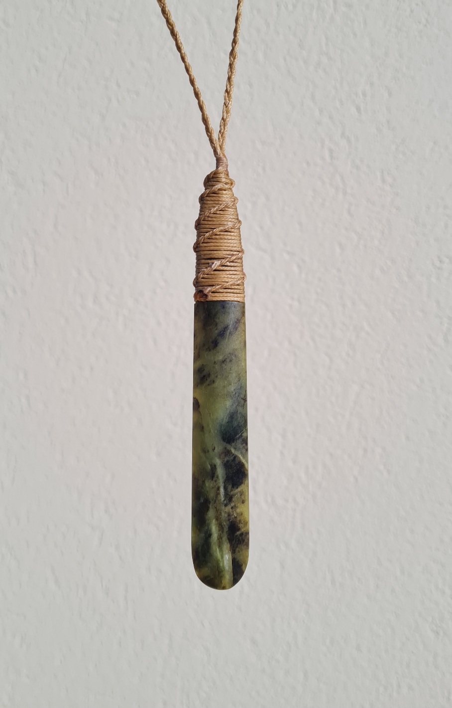 Lashed pounamu teardrop pendant 12.5cm long by 1.7cm wide.