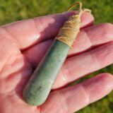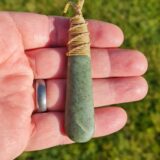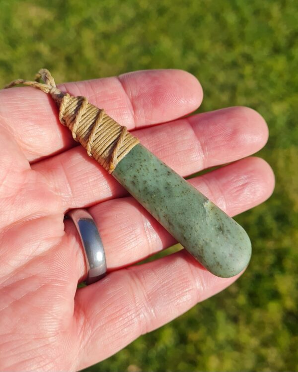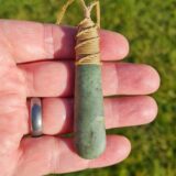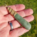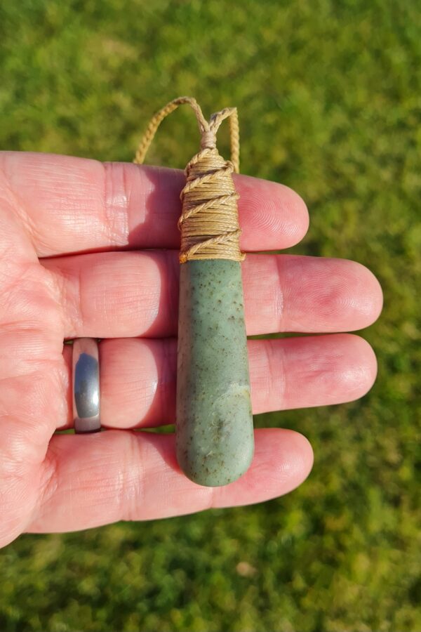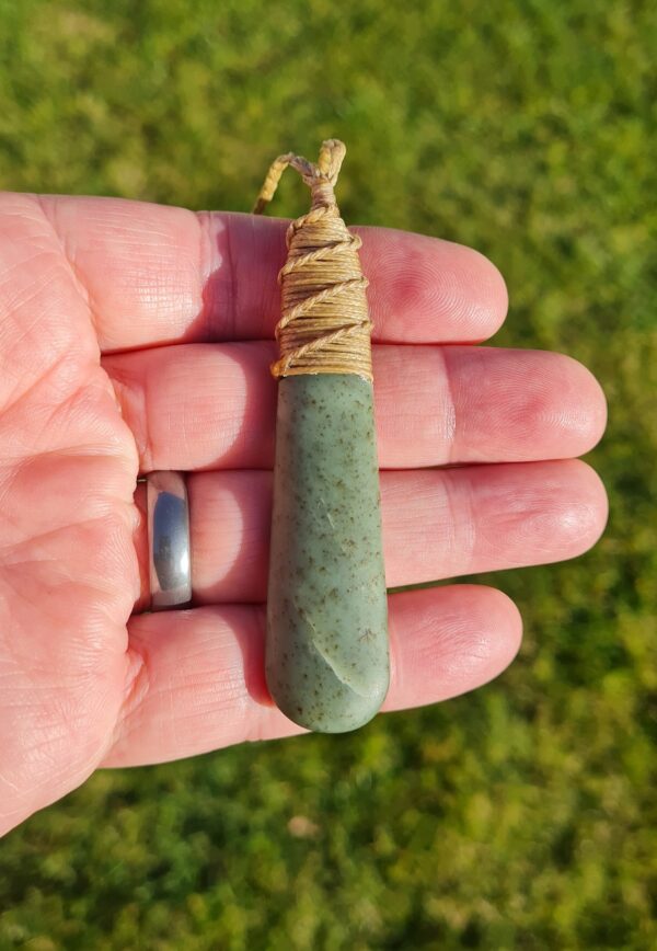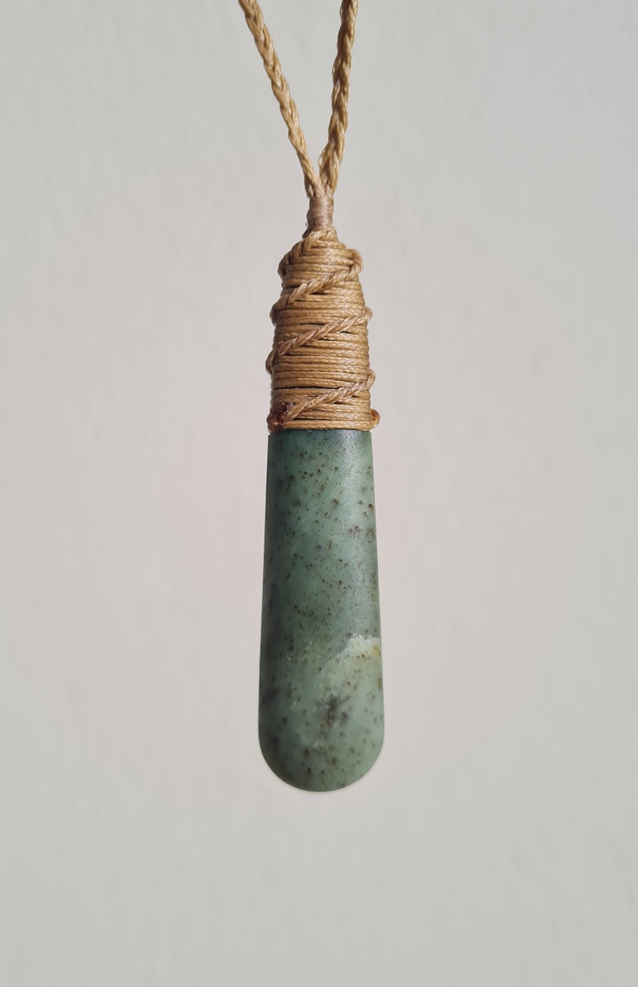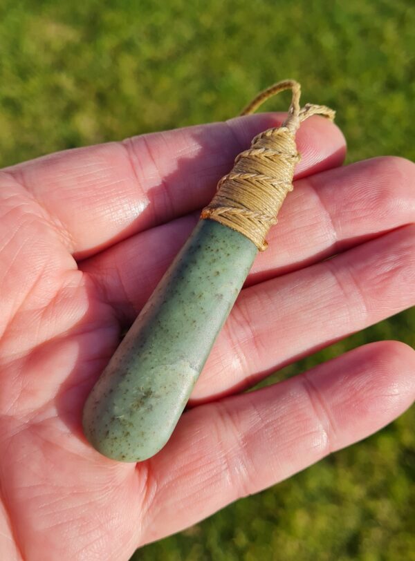 Lashed pounamu teardrop pendant 7.5cm long by 1.8cm wide.