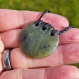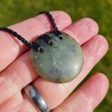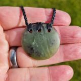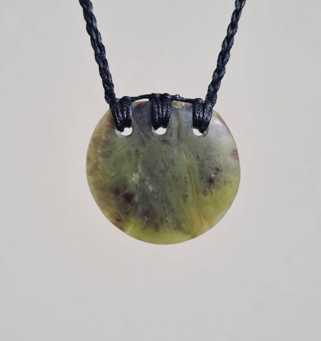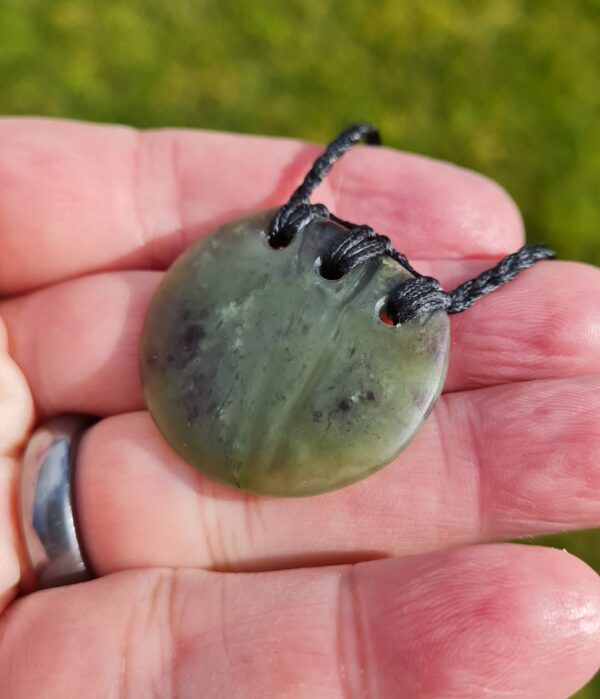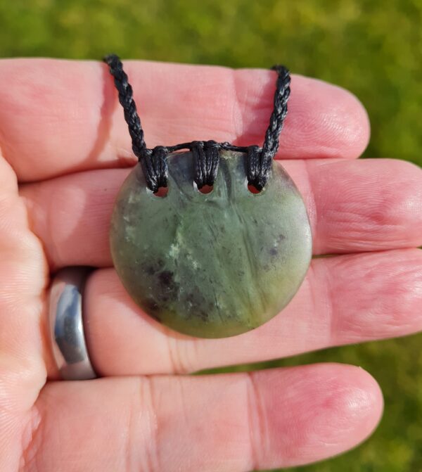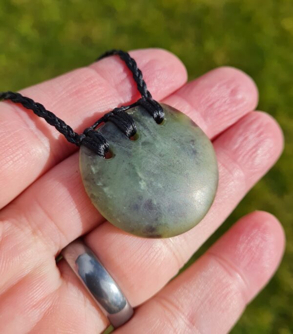 Pounamu disc pendant 3.3cm long by 3.5cm wide.